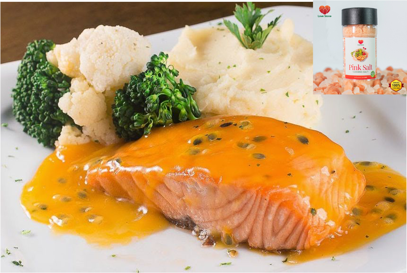 Cá hồi sẽ giúp bổ sung lượng Omega-3 cần thiết cho cơ thể, kết hợp cùng sốt chanh dây cung cấp lượng vitamin C dồi dào và muối hồng cân bằng hương vị lại còn rất nhiều khoáng chất có lợi sẽ cho bạn một món ăn rất giàu dinh dưỡng.