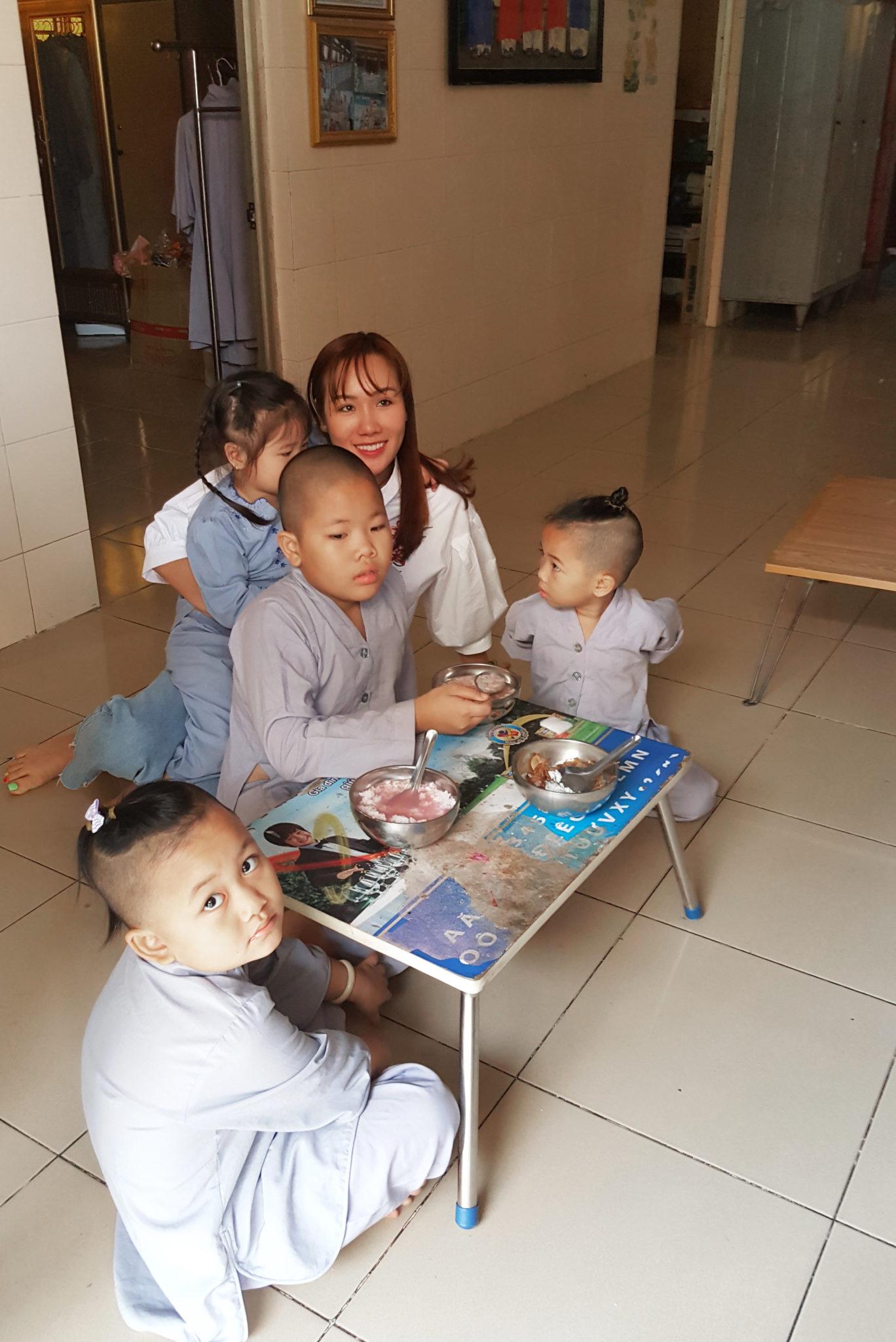 Chị Kim Nguyễn trò chuyện cùng các em nhỏ được chùa Bình An cưu mang