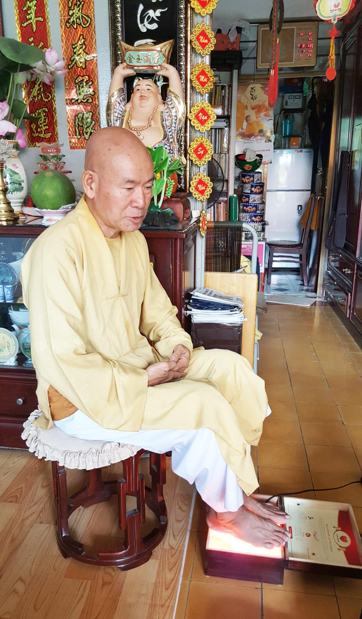 Sư trụ trì của chùa Huệ Nghiêm đang thử hộp đá muối massage chân Love Stone
