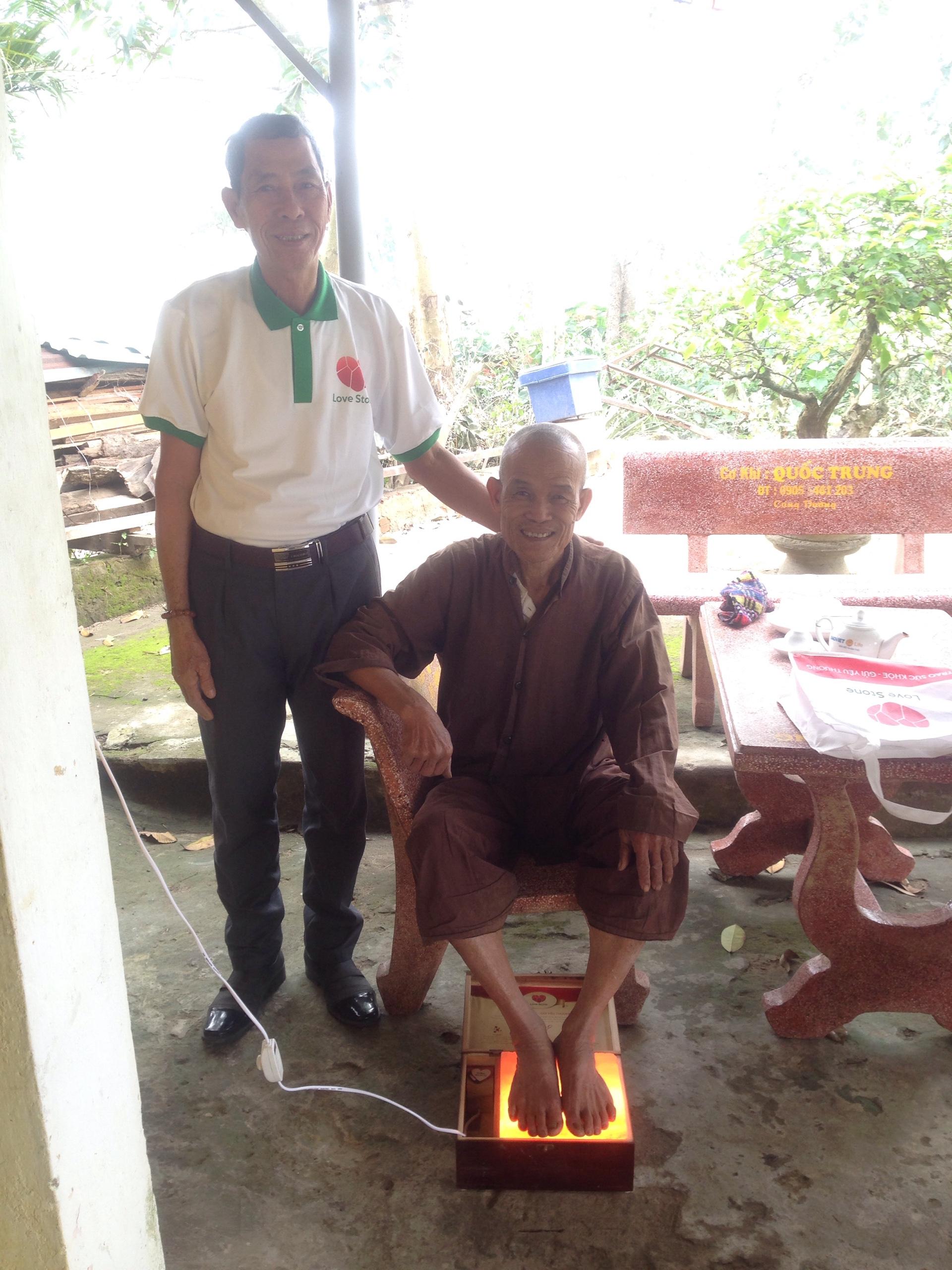 Sư Thầy của chùa Quán Thế Âm đang trải nghiệm sản phẩm hộp đá muối massage chân Love Stone.