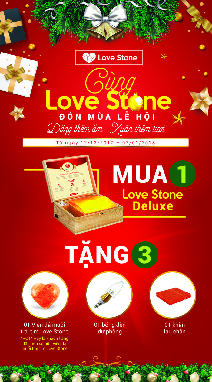 Cuối năm rồi! Cùng Love Stone đón mùa lễ hội với chương trình khuyến mãi tưng bừng, tri ân khách hàng: Mua một hộp đá muối massage chân Love Stone Deluxe tặng kèm 3 món quà giá trị.