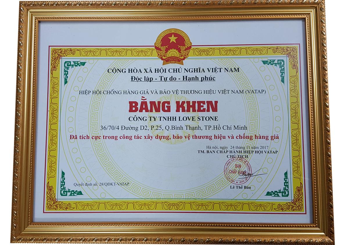 Cũng tại lễ kỷ niệm 10 năm Ngày phòng chống hàng giả, hàng nhái, Bộ Công thương và Hiệp hội Chống hàng giả và Bảo vệ thương hiệu Việt Nam đã trao bằng khen cho 40 tổ chức, cá nhân có thành tích tốt trong công tác phòng chống hàng giả, hàng nhái thời gian qua. Trong đó công ty Love Stone vinh dự là 1 trong 40 tổ chức, cá nhân được trao tặng bằng khen này.