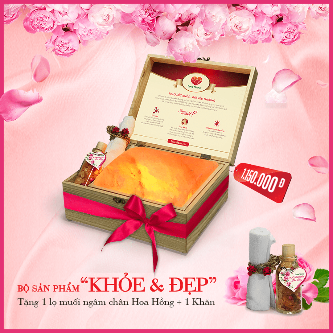 - Bộ sản phẩm “Khỏe & đẹp”: Khi mua 01 hộp đá muối massage chân Love Stone Deluxe, quý khách hàng sẽ được tặng 01 khăn + 01 chai muối ngâm chân hoa hồng (200g)