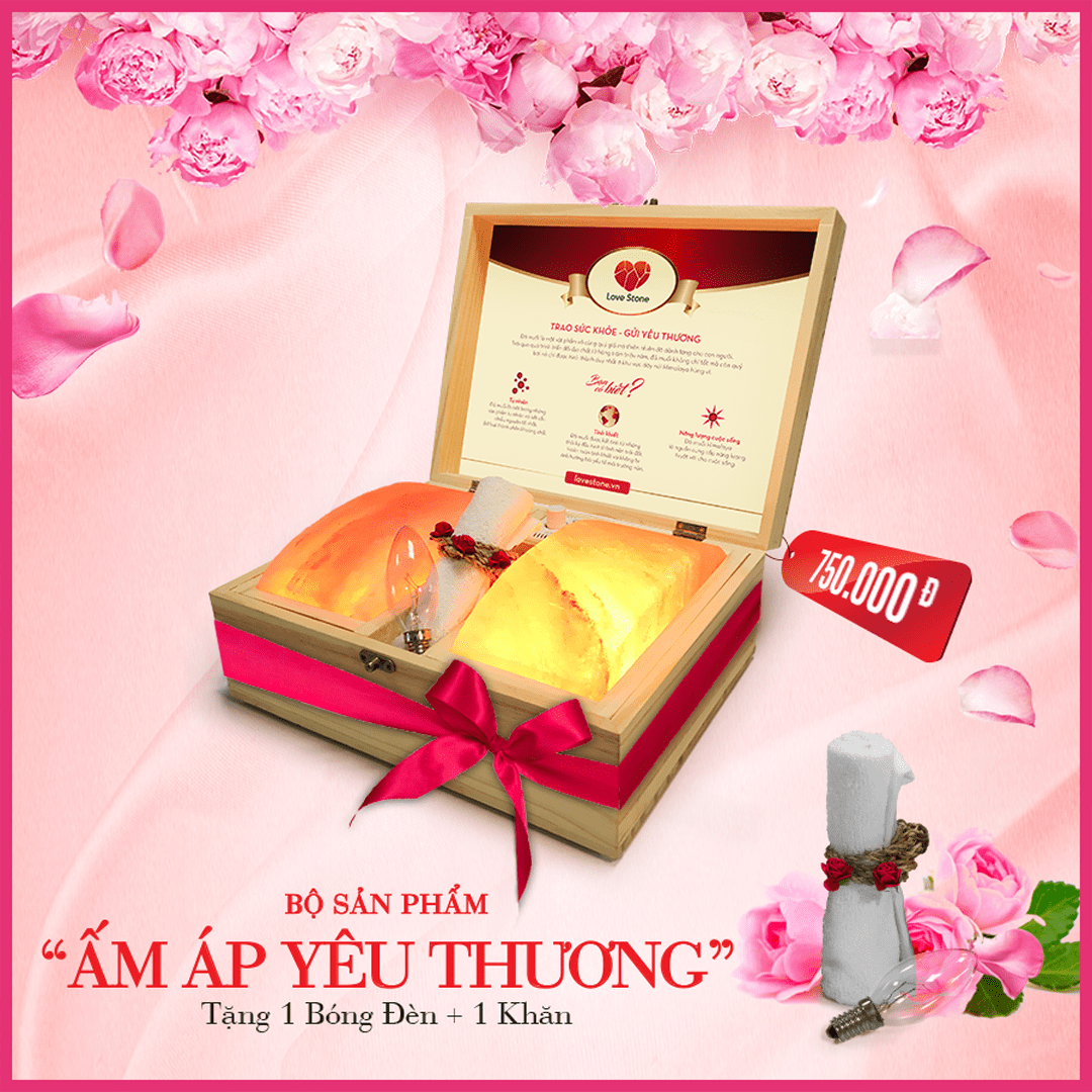 - Bộ sản phẩm “Ấm áp yêu thương”: Khi mua 01 hộp đá muối massage chân Love Stone Magic, quý khách hàng sẽ được tặng 01 khăn + 01 bóng đèn.